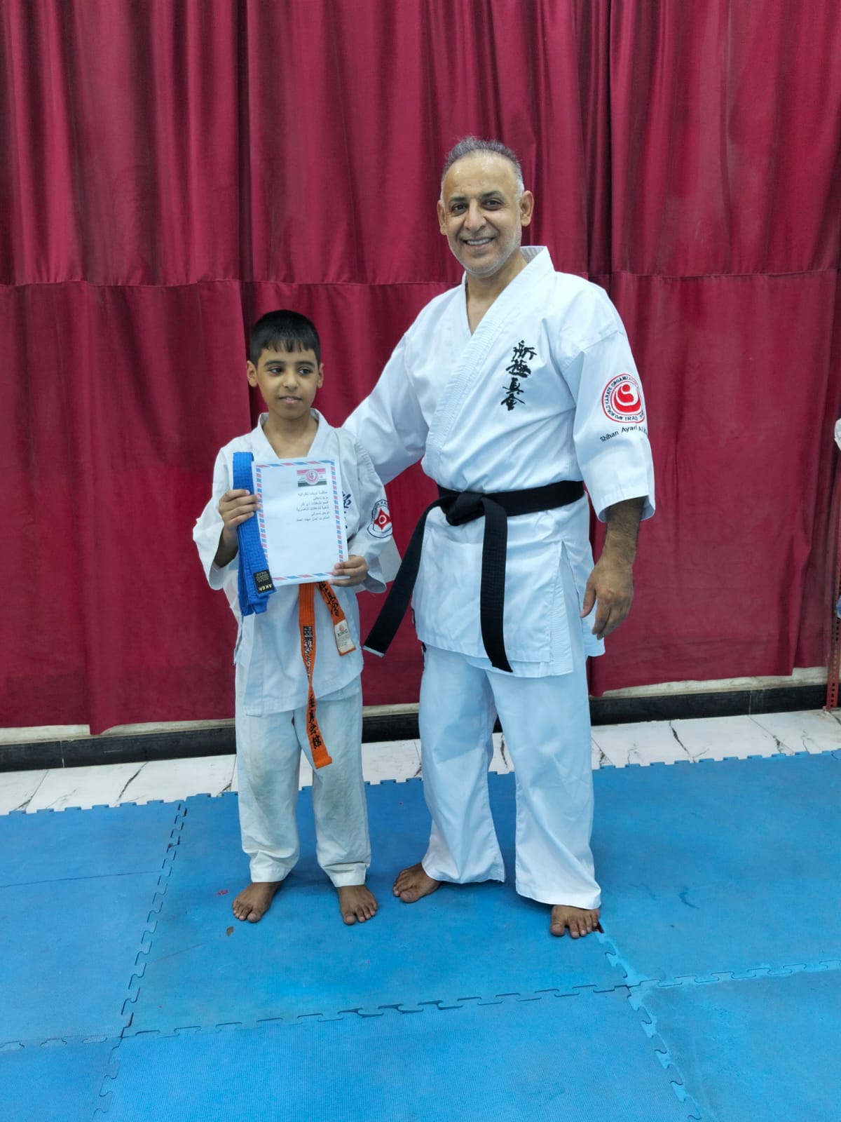 The ceremony was supervised by Sempai Muhannad Ahmed Abd Al-Sahib, head of the Nasiriyah Activities Branch, who presented a group of young boys with their new belts and appreciation certificates. The event was held in the presence of parents and the academy director. This honor came as a culmination of a journey that lasted several months of hard work, continuous training, diligent follow-up, and lectures on ethical values and the values of building a new Iraq.